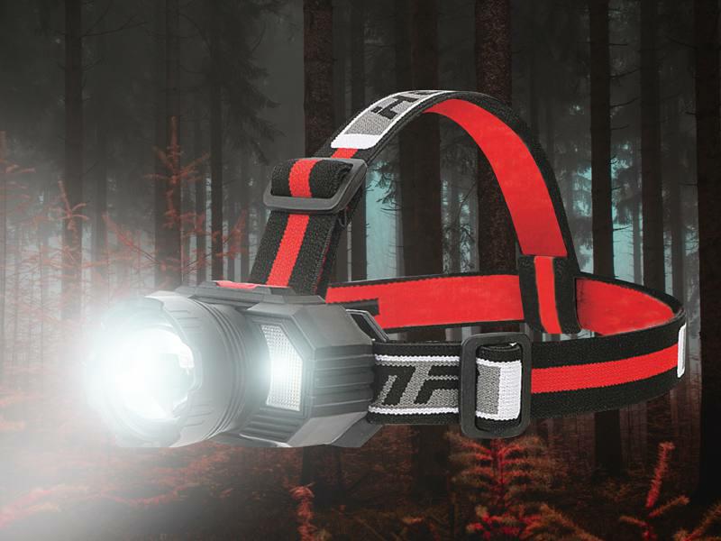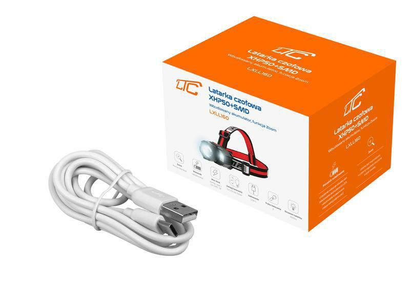 Kompaktowa latarka czołowa LTC zasilana akumulatorowo, wyposażona w diodę LED XHP50 z funkcją Zoom oraz dodatkowymi diodami LED SMD.